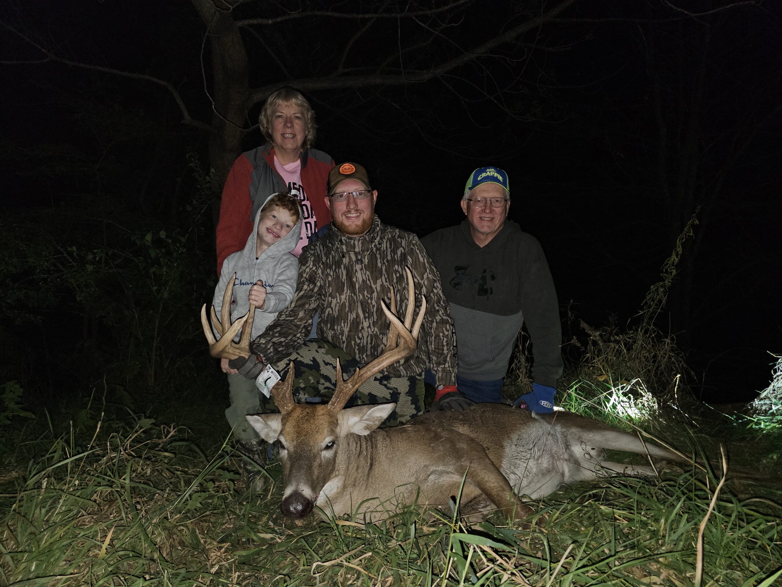 Harvest Story: I got permission on a new piece of ground on October 3rd. Dad and I set it up on the 7th. Wind was perfect tonight (Oct. 14th), and I got into a ladder along the creek overlooking the cut bean field. A group of does were feeding in the cut beans and he came out bumping them around at about 6:15pm. He eventually made his way across the fiele to the creek crossing 20 yards away. I was able to put a good shot on him and he fell within 30 yards of the shot. What made the night even better was recovering it with my wife, son, and parents!